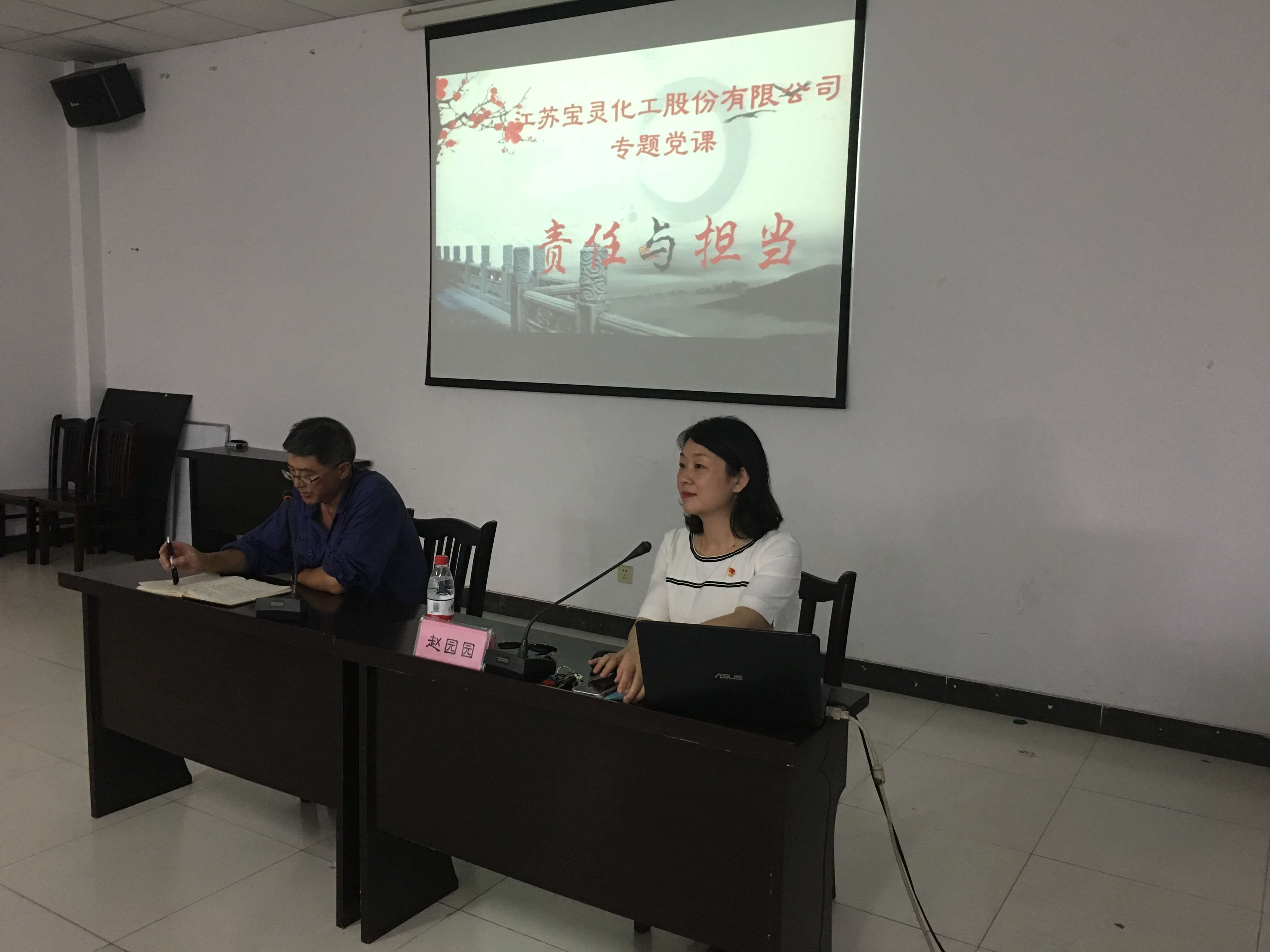 為深入學(xué)習(xí)貫徹黨的十九大精神和習(xí)近平新時(shí)代中國(guó)特色社會(huì)主義思想,紀(jì)念建黨 97 周年,堅(jiān)定理想信念,加強(qiáng)黨性修養(yǎng),寶靈化工黨委在6月底按期完成省、市委組織部《關(guān)于召開“進(jìn)一步解放思想,激勵(lì)新時(shí)代新?lián)?dāng)新作為”專題組織生活會(huì)》的基礎(chǔ)上,于7月19日下午組織全體黨員干部、入黨積極分子近六十人,舉行了“責(zé)任與擔(dān)當(dāng)”專題黨性教育,特邀南通市委黨校趙園園博士前來(lái)公司作《責(zé)任與擔(dān)當(dāng)》黨課輔導(dǎo)。7月23日的辦公會(huì)上,朱文新董事長(zhǎng)又進(jìn)一步強(qiáng)調(diào),全體黨員干部必須立足本職本崗,做到“對(duì)待工作極端盡責(zé),難題面前勇于負(fù)責(zé),出現(xiàn)過(guò)失敢于擔(dān)責(zé)”,把一個(gè)黨員干部該擔(dān)當(dāng)?shù)呢?zé)任體現(xiàn)到干事創(chuàng)業(yè)、奮發(fā)有為的具體行動(dòng)上。