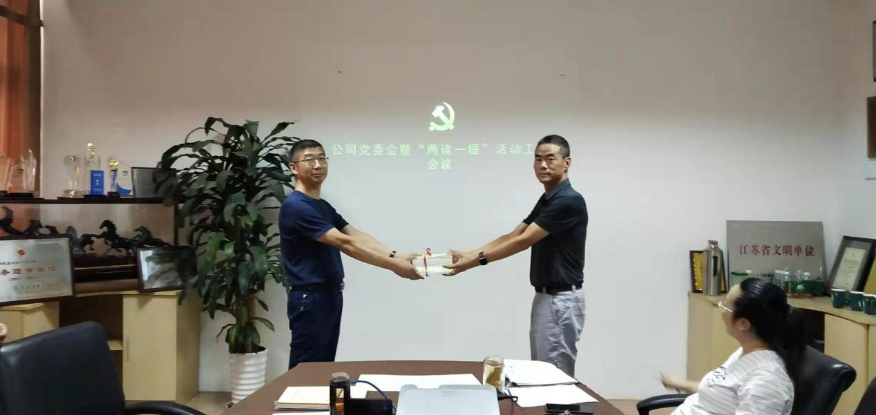為進(jìn)一步推進(jìn)公司“不忘初心,牢記使命”主題教育開(kāi)展,落實(shí)公司黨委“兩讀一提”活動(dòng)部署,促使黨員、干部養(yǎng)成良好讀書(shū)習(xí)慣,進(jìn)一步加強(qiáng)基層支部黨建工作建設(shè)、提升黨員、干部思想政治水平,8月22日下午,南通紡織控股集團(tuán)紡織染有限公司黨委組織開(kāi)展了“紅色贈(zèng)書(shū)”活動(dòng)。公司黨委書(shū)記、董事長(zhǎng)李志宏、黨委副書(shū)記盧李星等出席活動(dòng)。 活動(dòng)中,李志宏同志分別向本部黨支部、崇天黨支部依次贈(zèng)送《習(xí)近平新時(shí)代中國(guó)特色社會(huì)主義思想學(xué)習(xí)綱要》《不忘初心·牢記使命專(zhuān)題十講》、《黨員發(fā)展對(duì)象培訓(xùn)教材(2019年版)》《國(guó)有企業(yè)紀(jì)檢監(jiān)察工作手冊(cè)》等書(shū)籍。其中《習(xí)近平新時(shí)代中國(guó)特色社會(huì)主義思想學(xué)習(xí)綱要》為全體黨員人手一本。