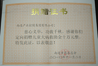 在本月初召開(kāi)的“2010年慈善南通主題專(zhuān)場(chǎng)文藝晚會(huì)”上,產(chǎn)控集團(tuán)及其控股的上市公司南通科技和江山股份聯(lián)袂上臺(tái)接收市慈善總會(huì)發(fā)給的捐贈(zèng)證書(shū),被與會(huì)者視為佳話。 據(jù)悉,為幫助我市患大病(白血病、先天性心臟病、尿毒癥、惡性腫瘤)兒童,產(chǎn)控集團(tuán)定向捐贈(zèng)兒童大病救助基金10萬(wàn)元,南通科技和江山股份各捐贈(zèng)20萬(wàn)元,合計(jì)50萬(wàn)元。