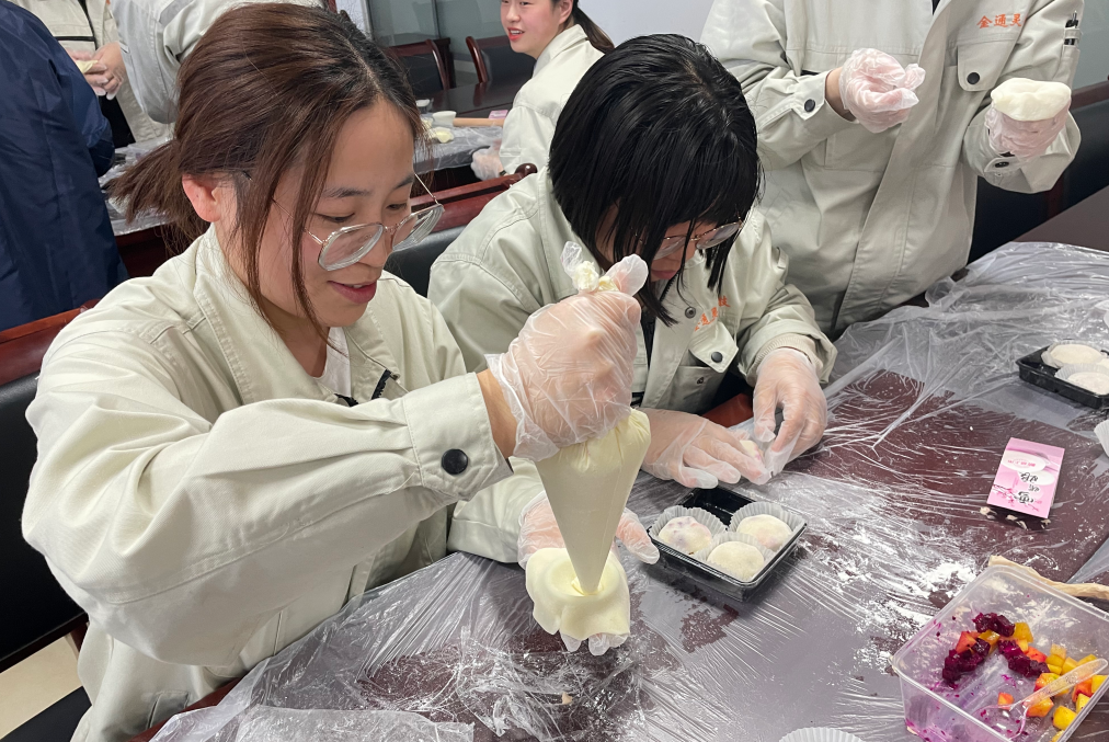 當天下午,金通靈近100名女職工歡聚813活動室,在張老師的現場制作教導下,分別制作了雪媚娘和便當蛋糕?;顒蝇F場,張老師講解了烘焙知識和制作流程,職工們在認真聆聽后,體驗著自己動手制作甜品的樂趣,享受著快樂的烘焙時光。隨著時間的推移,一個又一個飽滿、垂涎欲滴的雪媚娘、一個個精致的便當蛋糕制作完成。