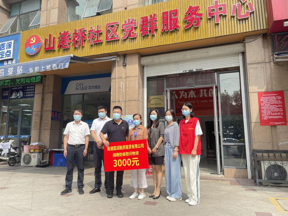 8月26日下午,南通國潤融資租賃有限公司支部書記、董事長陳大鵬同志,帶領(lǐng)公司主要領(lǐng)導(dǎo)班子及黨員干部走訪了觀音山街道山港橋社區(qū)防疫一線,同時(shí)捐贈(zèng)價(jià)值3000元的愛心物資,并委派兩名同志下沉,積極參與社區(qū)疫情防控志愿服務(wù)工作。
