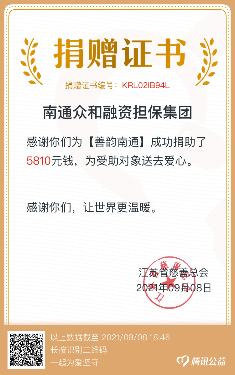 為進(jìn)一步弘揚(yáng)中華民族扶貧濟(jì)困的傳統(tǒng)美德,倡導(dǎo)“以人為本,樂于奉獻(xiàn)”的互助精神,眾和擔(dān)保積極發(fā)動發(fā)動、廣泛宣傳,第一時間組織全體干部職工開展“慈善一日捐”活動。公司領(lǐng)導(dǎo)班子成員率先垂范,帶頭捐款,全體干部職工踴躍參與,奉獻(xiàn)愛心,參與度100%。截至9月8日,共籌得善款5810元,募集資金將統(tǒng)一交至南通市慈善總會,用于扶貧、慈善救助項目。