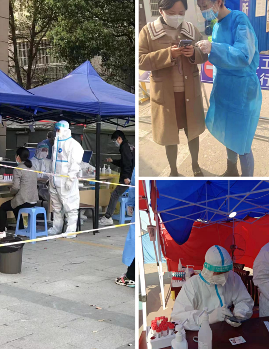 “您好,請配合我們測量體溫”、“請大家?guī)Ш每谡帧?、“請?zhí)崆皽蕚浜蒙矸葑C”······他們在現(xiàn)場協(xié)助查驗雙碼、測量體溫、維護現(xiàn)場秩序、對老人進行掃碼幫助等,大慶社區(qū)、大南社區(qū)、濠東社區(qū)等均可見揚子碳素志愿者們忙碌的身影。