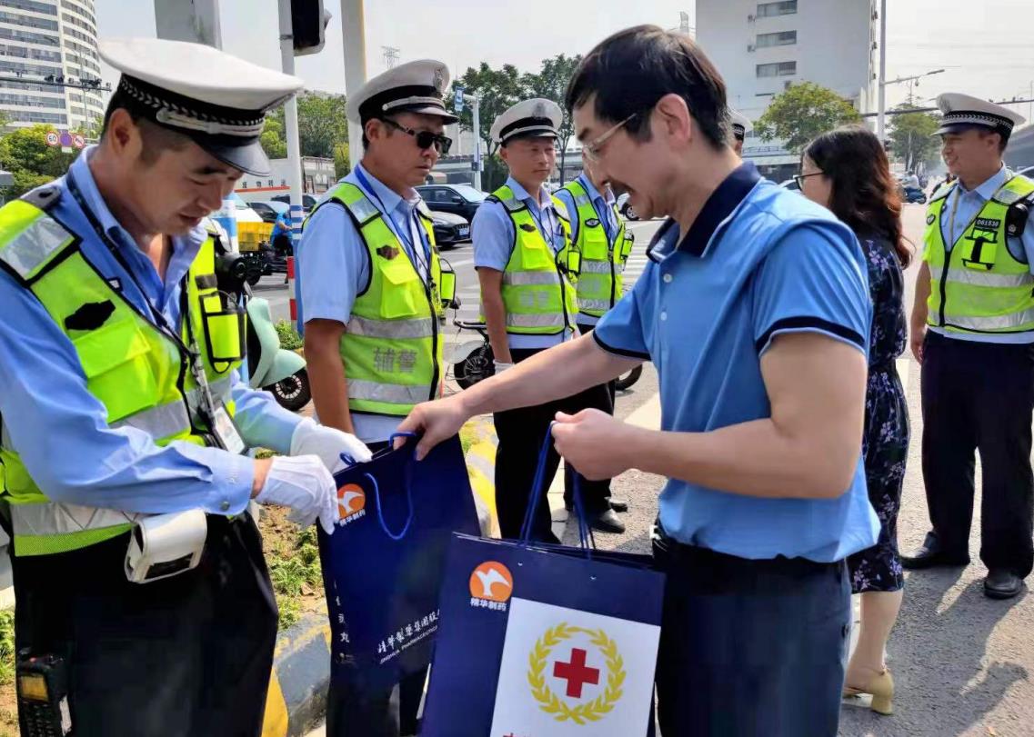 8月12日上午,精華制藥集團(tuán)和南通市紅十字會(huì)相關(guān)負(fù)責(zé)同志來到南通市公安局交警支隊(duì)四大隊(duì)及四大隊(duì)所轄兩個(gè)路段,慰問高溫下堅(jiān)守崗位的一線交警。精華制藥集團(tuán)監(jiān)事會(huì)主席薛紅衛(wèi)和南通市紅十字會(huì)黨組成員朱建新將季德勝健膚皂、潔面乳及防疫藥茶等防暑防疫物資送到路面執(zhí)勤的交警手中,向他們表達(dá)了由衷的敬意。